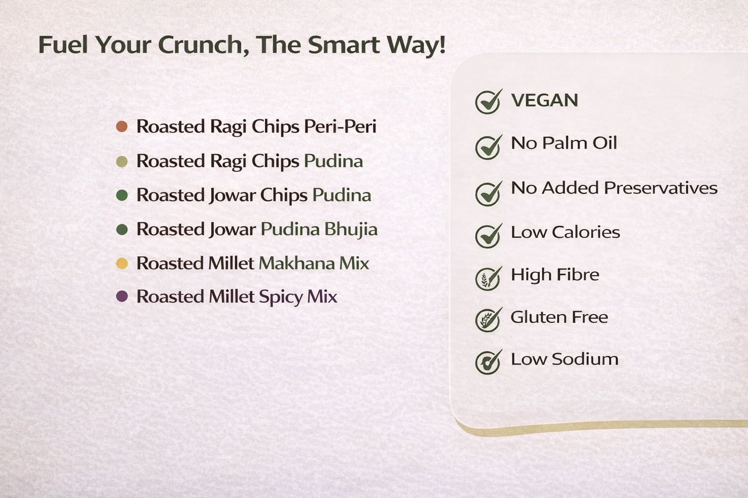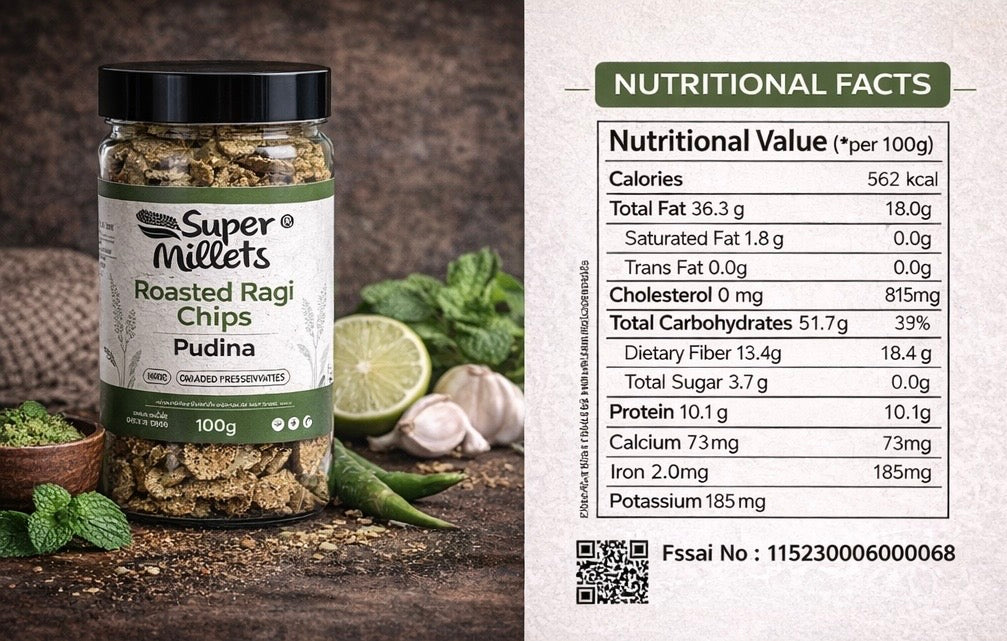 Fresh, crunchy, and seriously chatpata, Roasted Ragi Chips – Pudina bring together the goodness of ragi with the cool kick of minty pudina. Roasted to perfection, these millet chips are vegan, low-calorie, made with no palm oil and no added preservatives. Every bite delivers a refreshing burst of flavour that feels light yet satisfying. Ideal for anytime snacking, work-from-home munching, or guilt-free binge sessions, these pudina ragi chips prove that healthy snacks can be cool, desi, and totally Gen-Z approved.